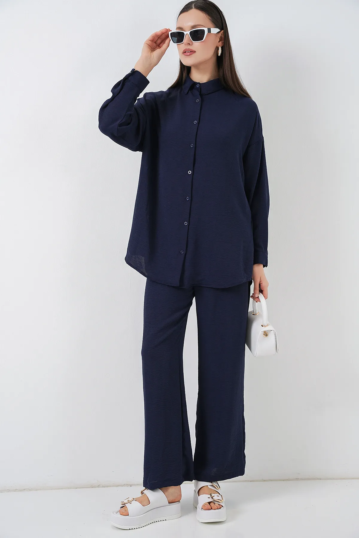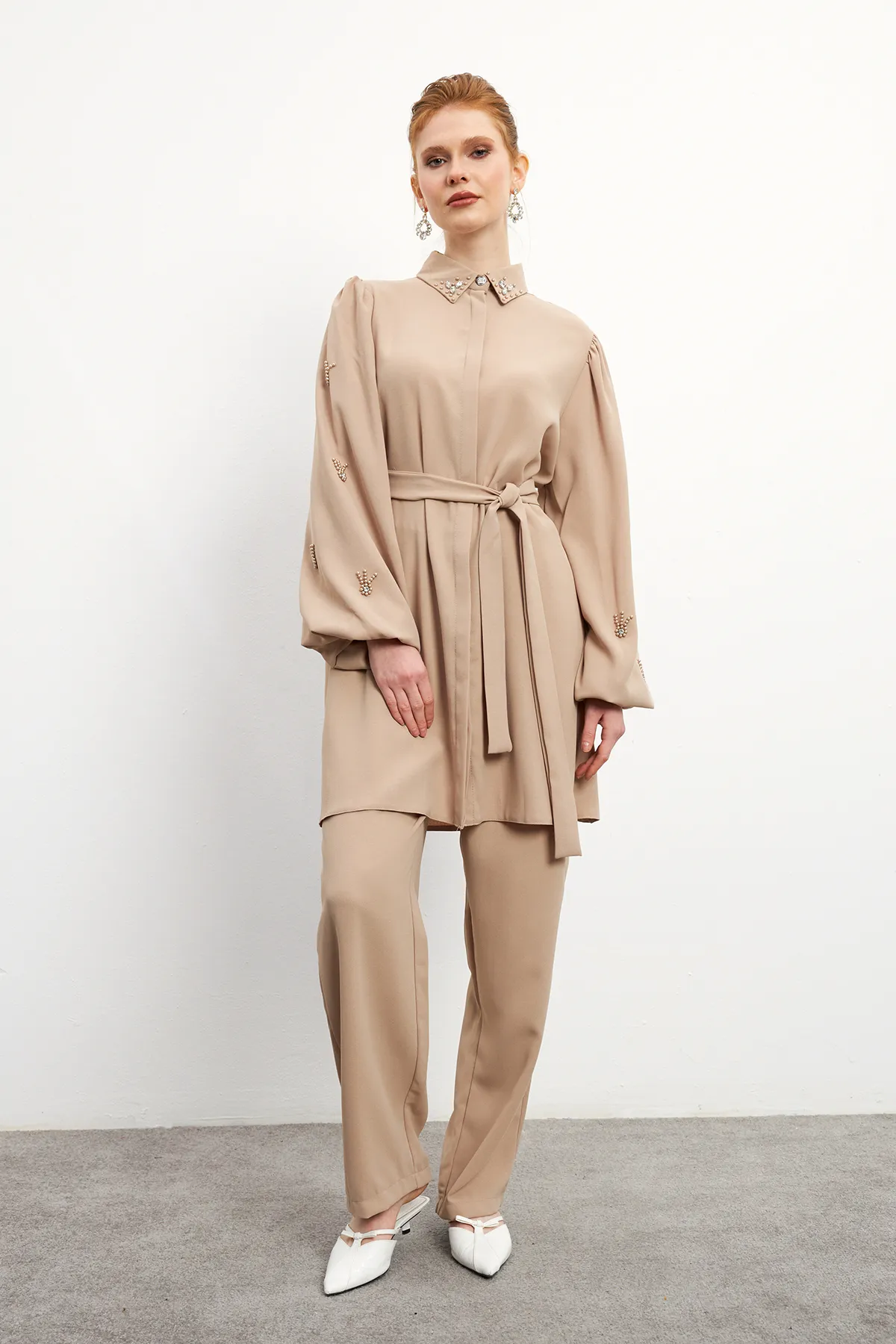 طقم نسائي محتشم مكوّن من قميص وبنطال جينز مزين بتفاصيل لؤلؤ وأحجار