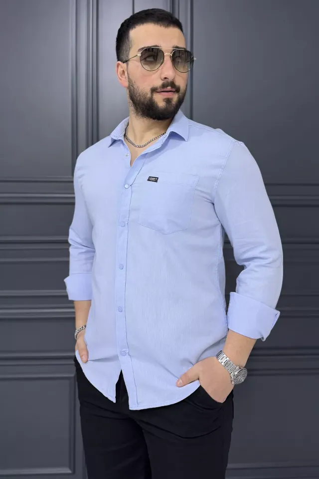 قميص رجالي مخطط بأكمام طويلة، كلاسيكي ومتعدد الاستخدامات، يتميز بياقة قميص وأزرار أمامية. مصمم بقصّة عادية لراحة يومية ومظهر أنيق.