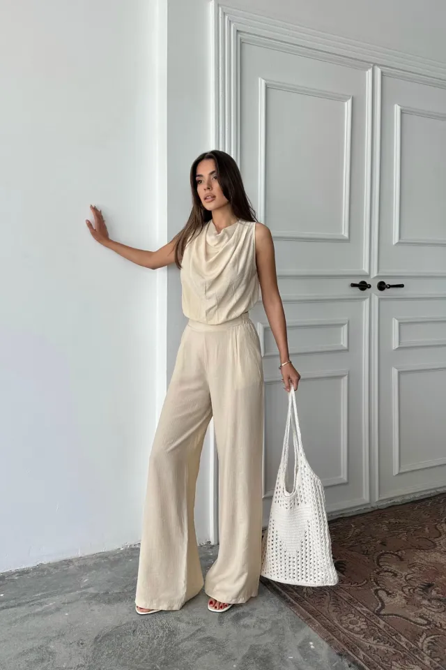 طقم بنطلون نسائي بأكمام قصيرة وياقة على شكل حرف V، مزين بتفاصيل ترتر تضيف لمسة من الأناقة. مصنوع من قماش فسكوز ناعم لراحة وانتعاش يدومان طوال اليوم.