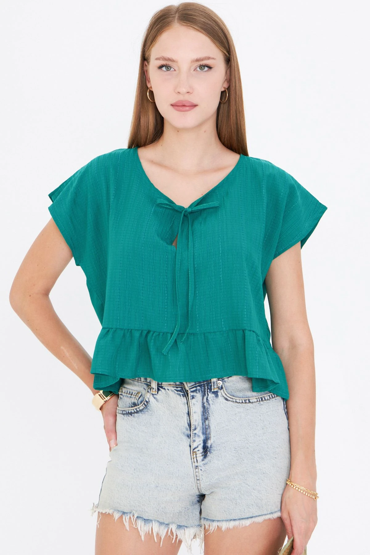 بلوزة أيروبين بأكمام قصيرة قابلة للطي وياقة V مع فتحات جانبية أنيقة، تصميم سادة ومريح يناسب التنقلات اليومية وأجواء الصيف.