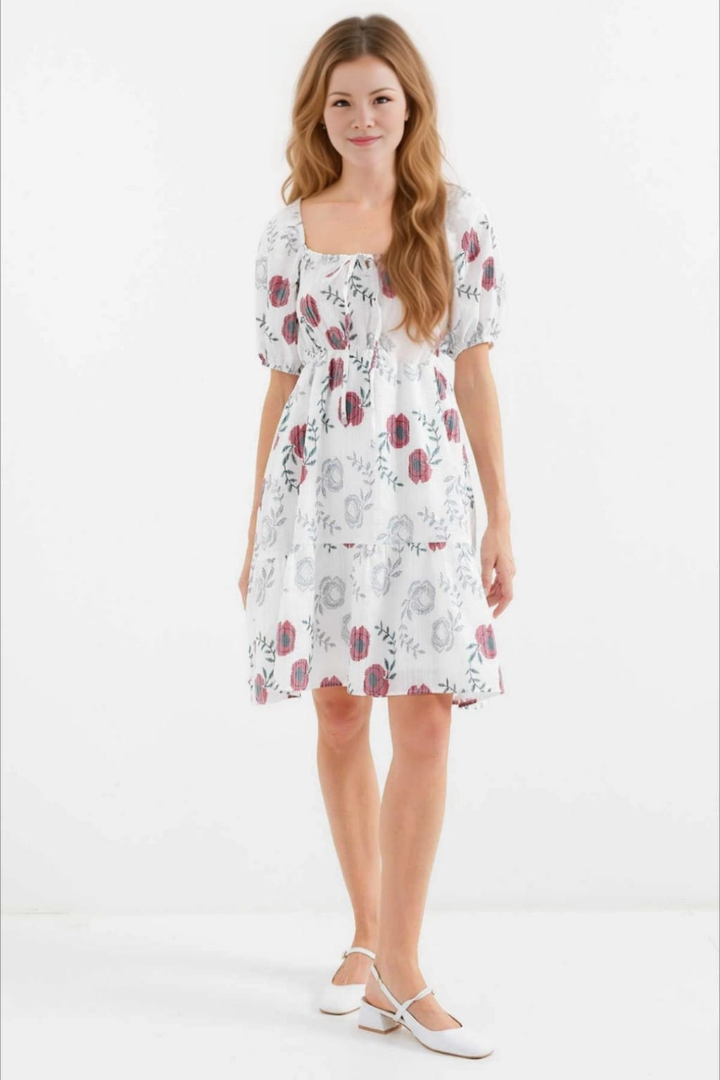 فستان ميني فيسكوز بقصة A بياقة V باكمام قصيرة منقوش