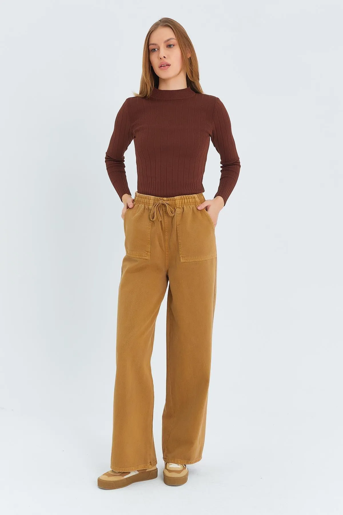 بنطلون نسائي مخطط بخصر عالي مطاطي وقصة مريحة، يجمع بين الراحة والأناقة للاستخدام اليومي.