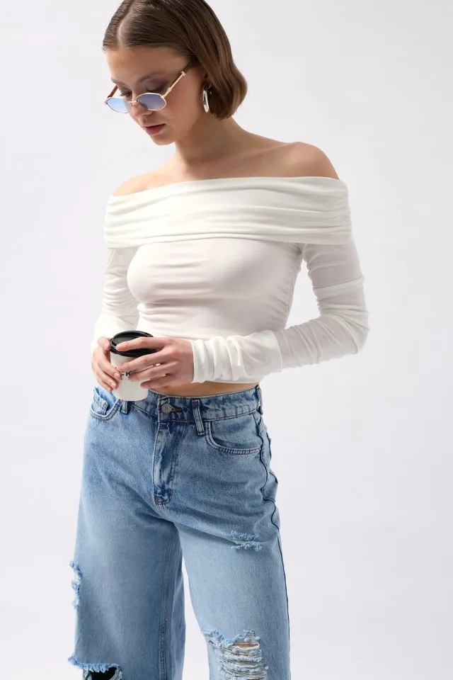 بلوزة نسائية لامعة بياقة دائرية وأكمام قصيرة - Beyond Store