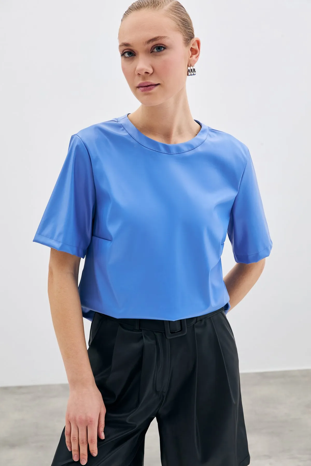 بلوزة نسائية لامعة بياقة دائرية وأكمام قصيرة