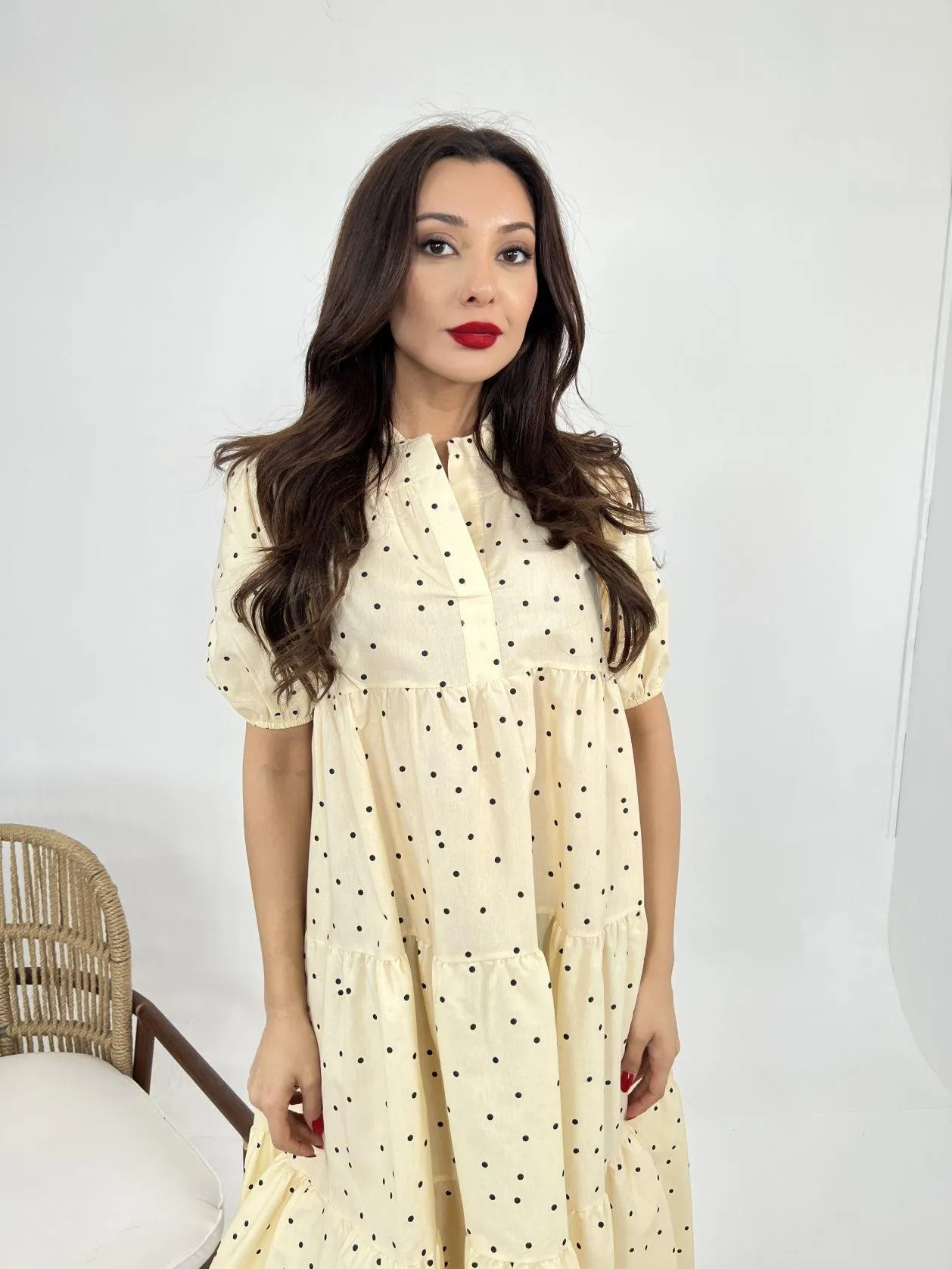 فستان ميدي فيسكوز كلوش بياقة دائرية واسعة منقوش بطيات للنساء