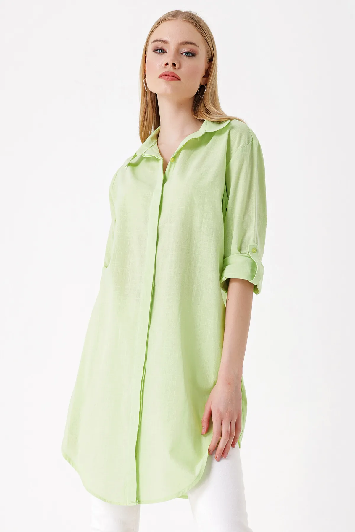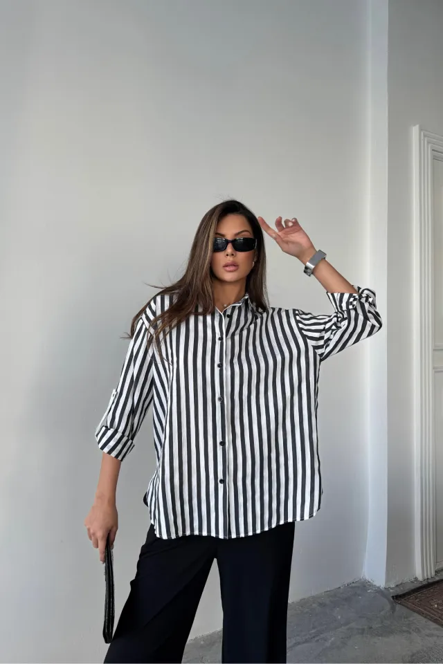 قميص اوفر سايز بازرار امامية مصنوع من 53٪ فيسكوز و47٪ قطن يظهر على موديل بطول 170 سم بمقاس S