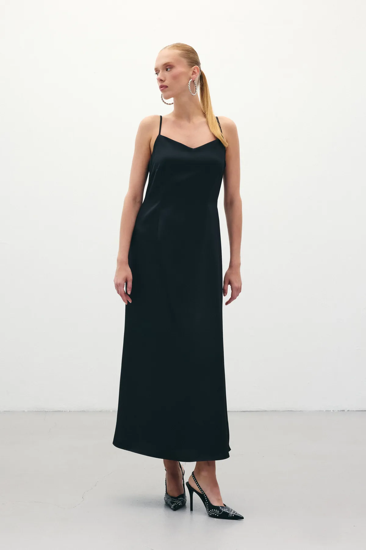 فستان نسائي ميدي بياقة V بلا أكمام بقصة A