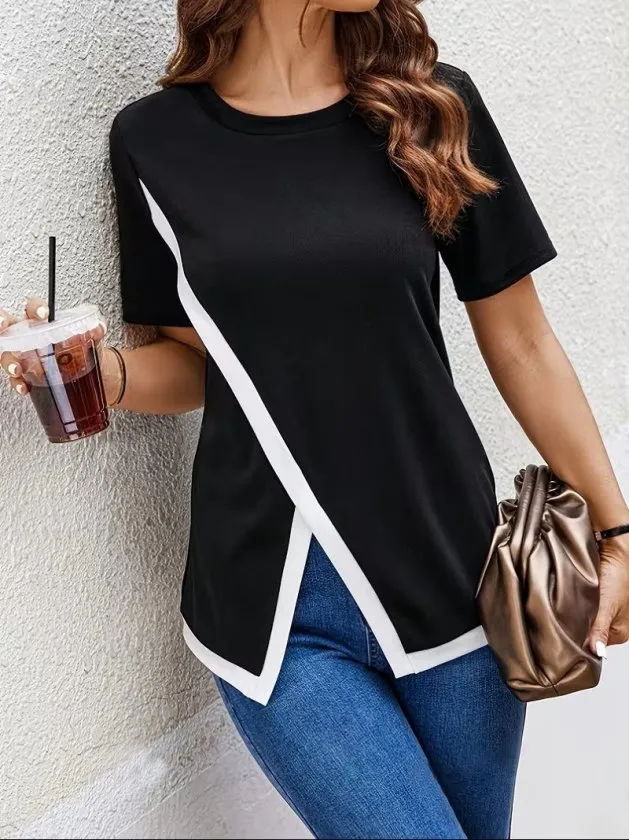 بلوزة قطنية 100% مطبوعة بياقة دائرية وأكمام قصيرة للنساء