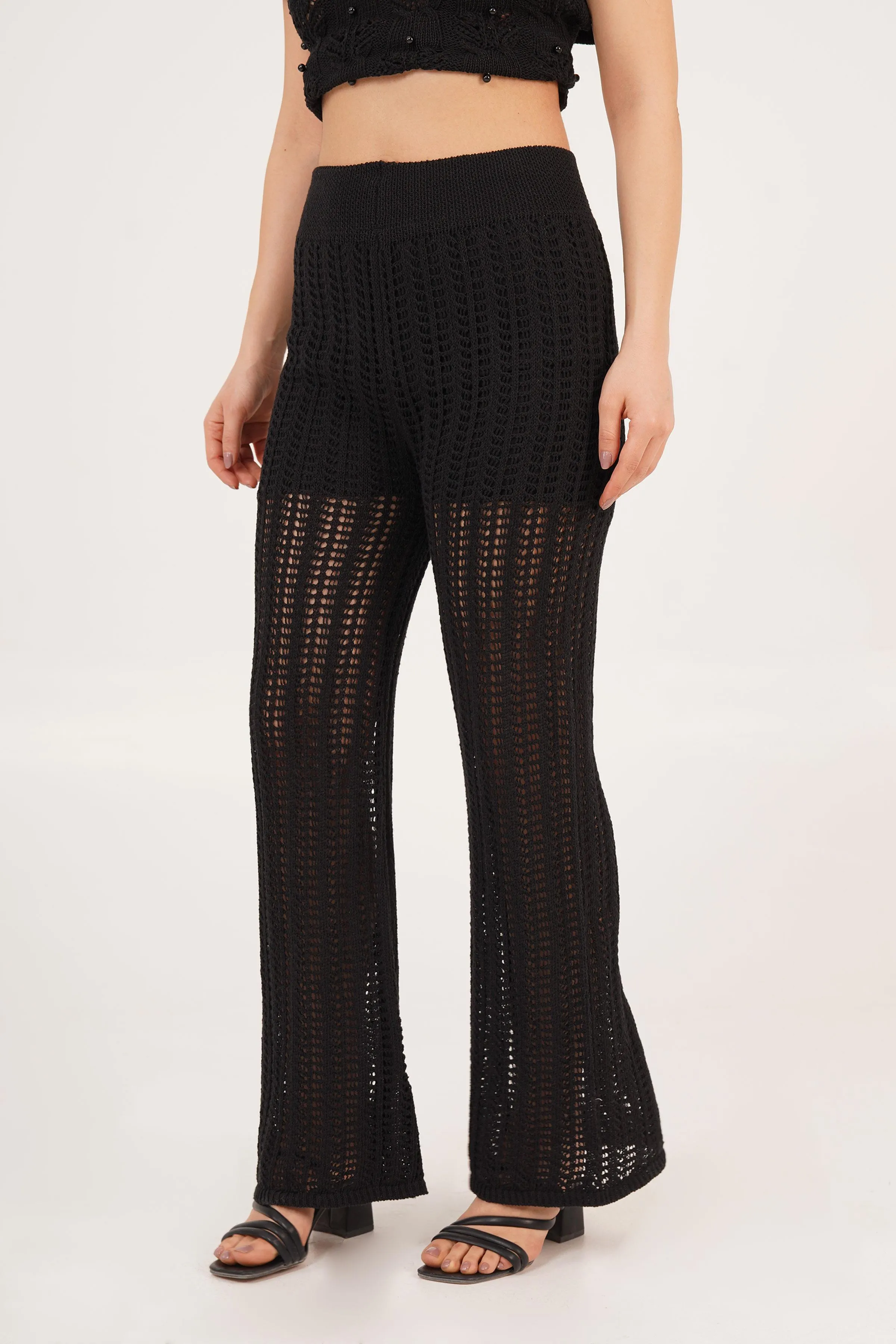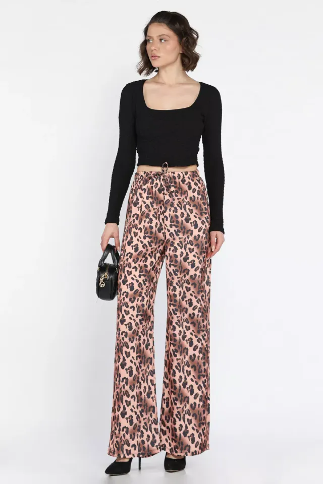 بنطلون نسائي واسع الساق بخصر عالي مع تفصيل توكة مصنوع من قماش مرن يمنح اطلالة يومية انيقة