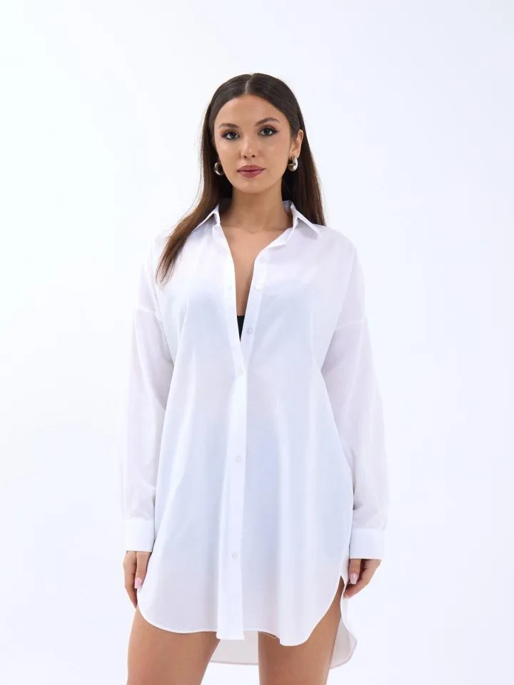 قميص نسائي بتفصيل روالة خلفية وخطوط نظيفة وياقة قميص كلاسيكية، قطعة يومية راقية لإطلالة صيفية مرتاحة.