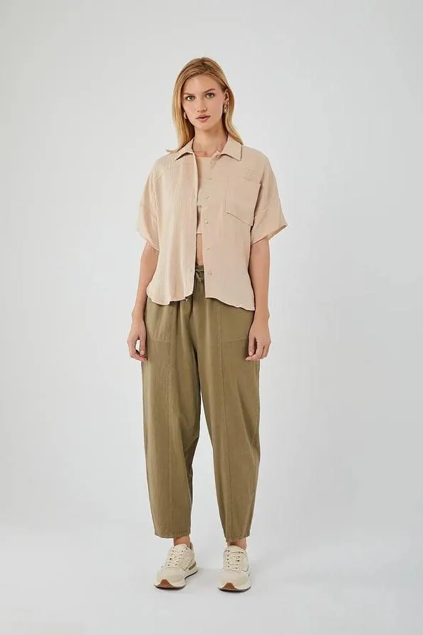 قميص بقصة مريحة بأكمام طويلة وخطوط رفيعة مع نسيج مضلع وياقة كلاسيكية وأزرار أمامية، يمنحك إحساس الخفة والعملية لإطلالة يومية منعشة، مثالي للعمل أو الطلعات الكاجوال.