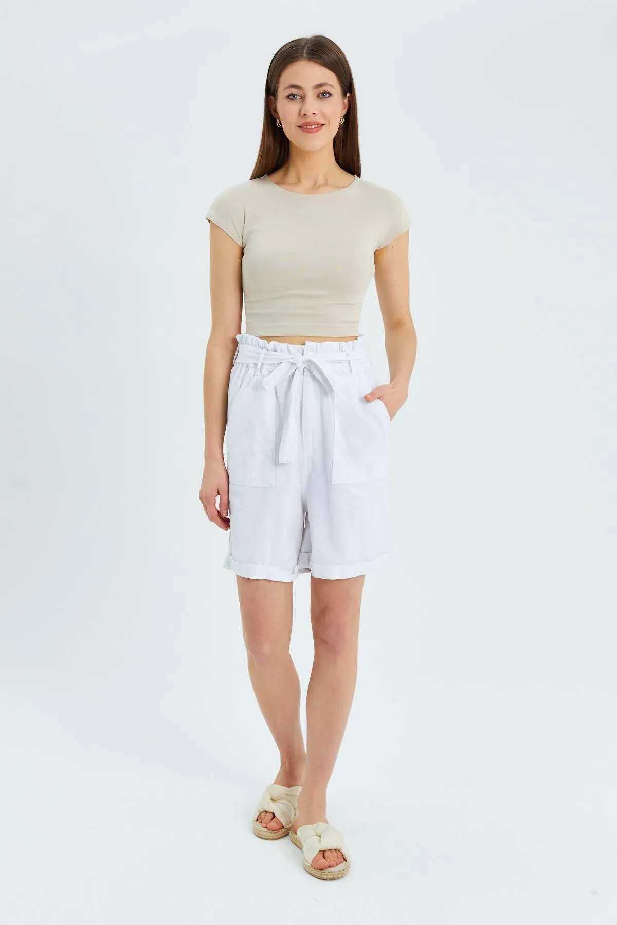 شورت موسلين بخصر عالي مطاطي وجيوب جانبية لراحة وأناقة صيفية خفيفة.