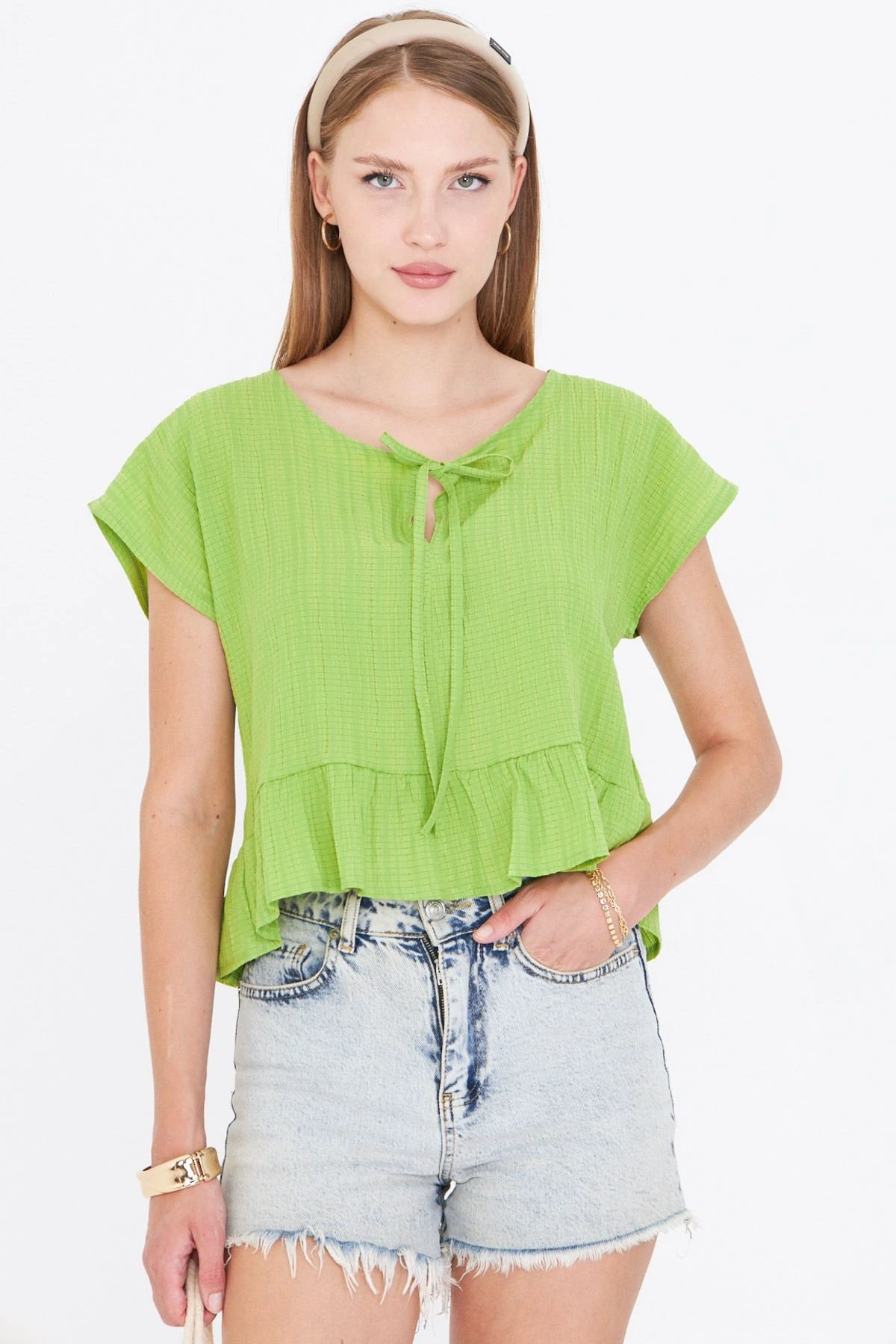 رقة وأناقة بلا عناء—بلوزة بقصة مرتاحة بأكتاف منكسرة مزخرفة بنقشة الزهور، مثالية لإطلالة صيفية يومية أنيقة.