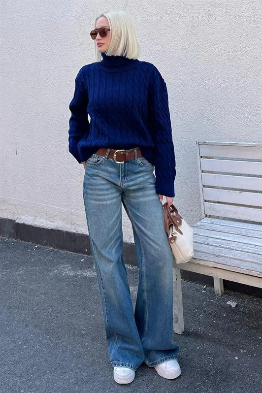 كنزة تريكو نسائية اوفرسايز بياقة قائمة ونقشة مضفرة مثالية لإطلالات خريفية وشتوية دافئة