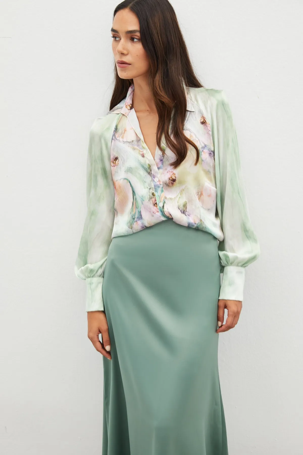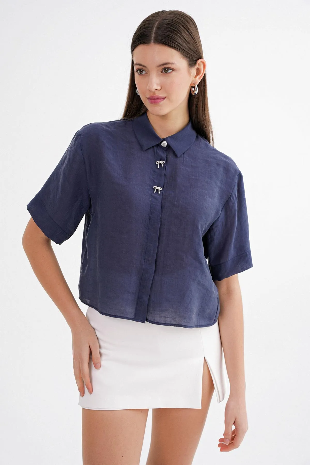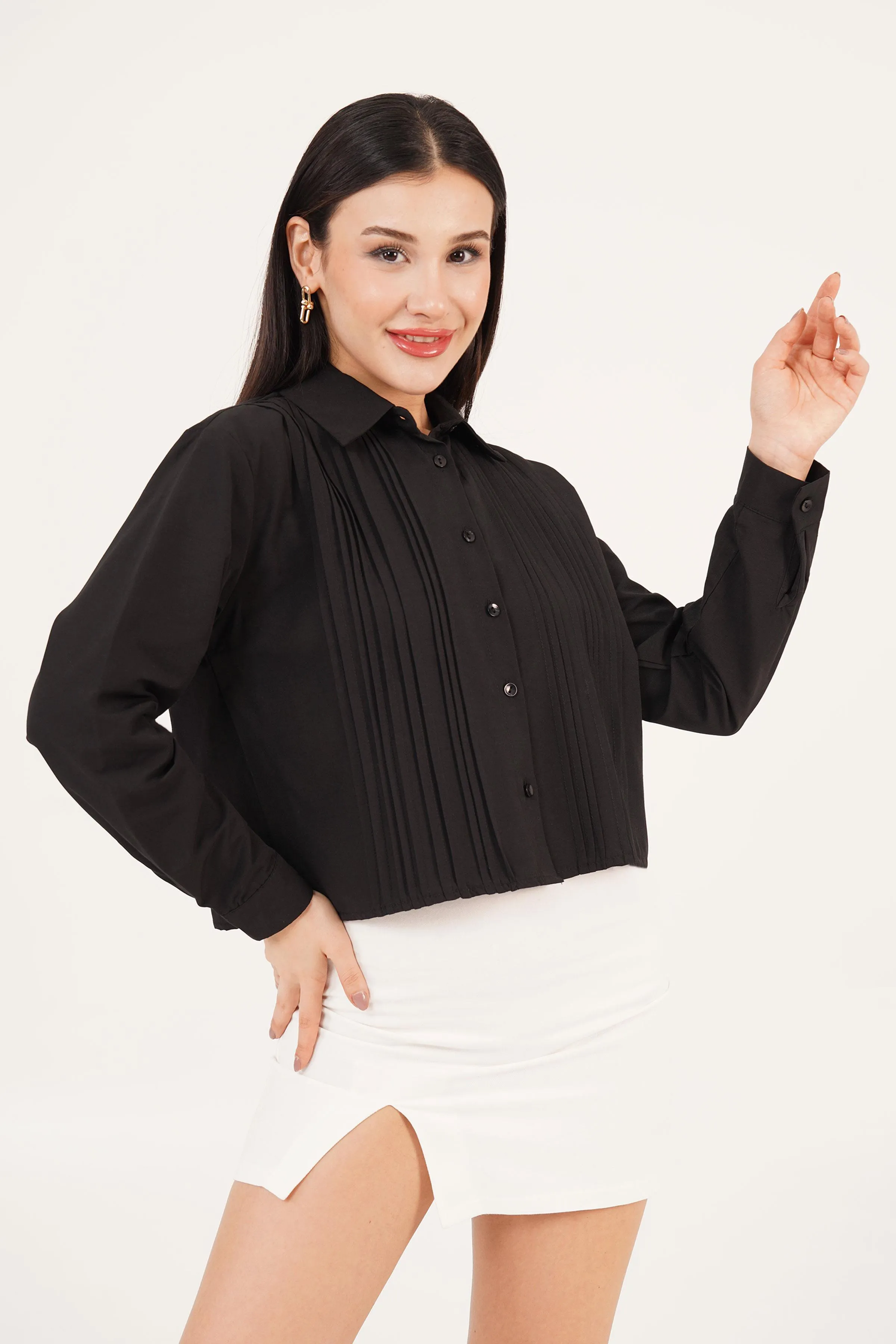 قميص نسائي قصير بياقة بولو وأكمام طويلة مع طيات أمامية أساسي