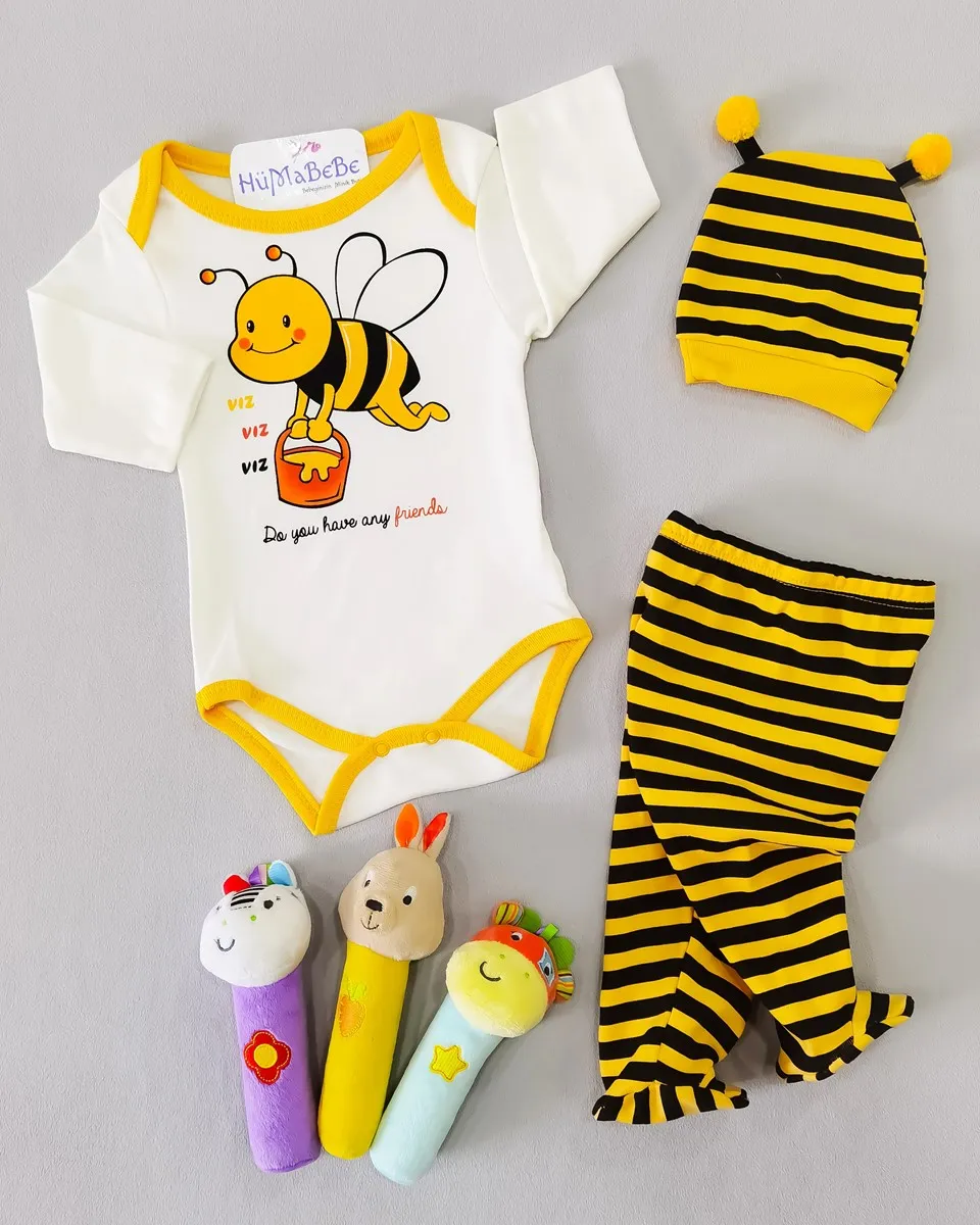 طقم رضّع يونيسكس مكون من قطعتين، يشمل تيشيرت قصير الأكمام مزين بتطريز بارز على شكل دب، مع شورت دنيم ناعم بخصر مطاطي، يمنح راحة وأسلوبًا مرحًا للاستخدام اليومي.