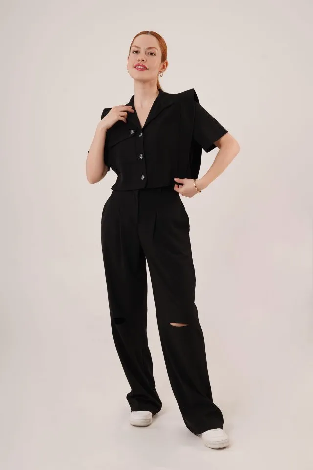 طقم بلوزة أنيقة بدون أكمام بياقة دائرية مع بنطال واسع الساقين. مصنوع من قماش خفيف الوزن لإطلالة صيفية أنيقة وخفيفة.