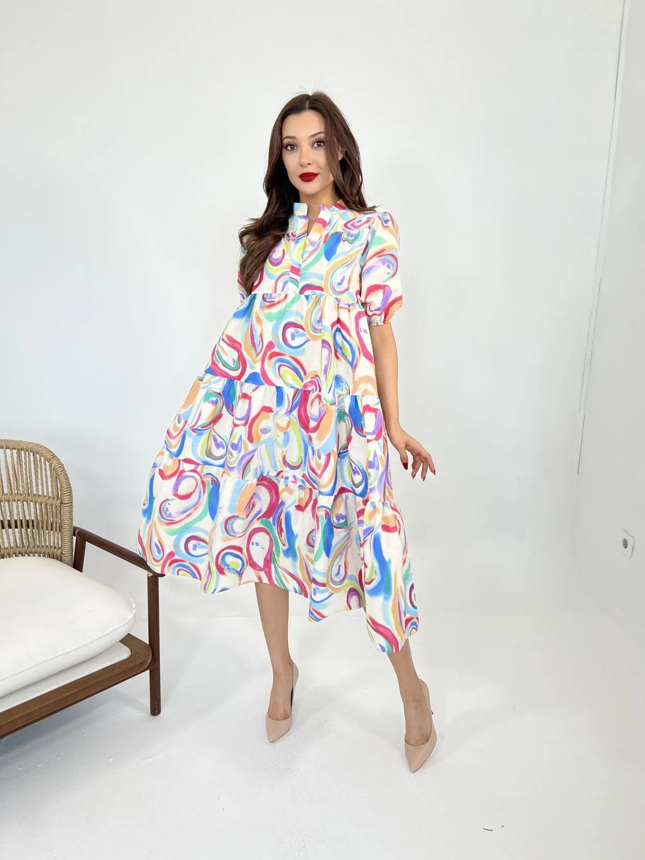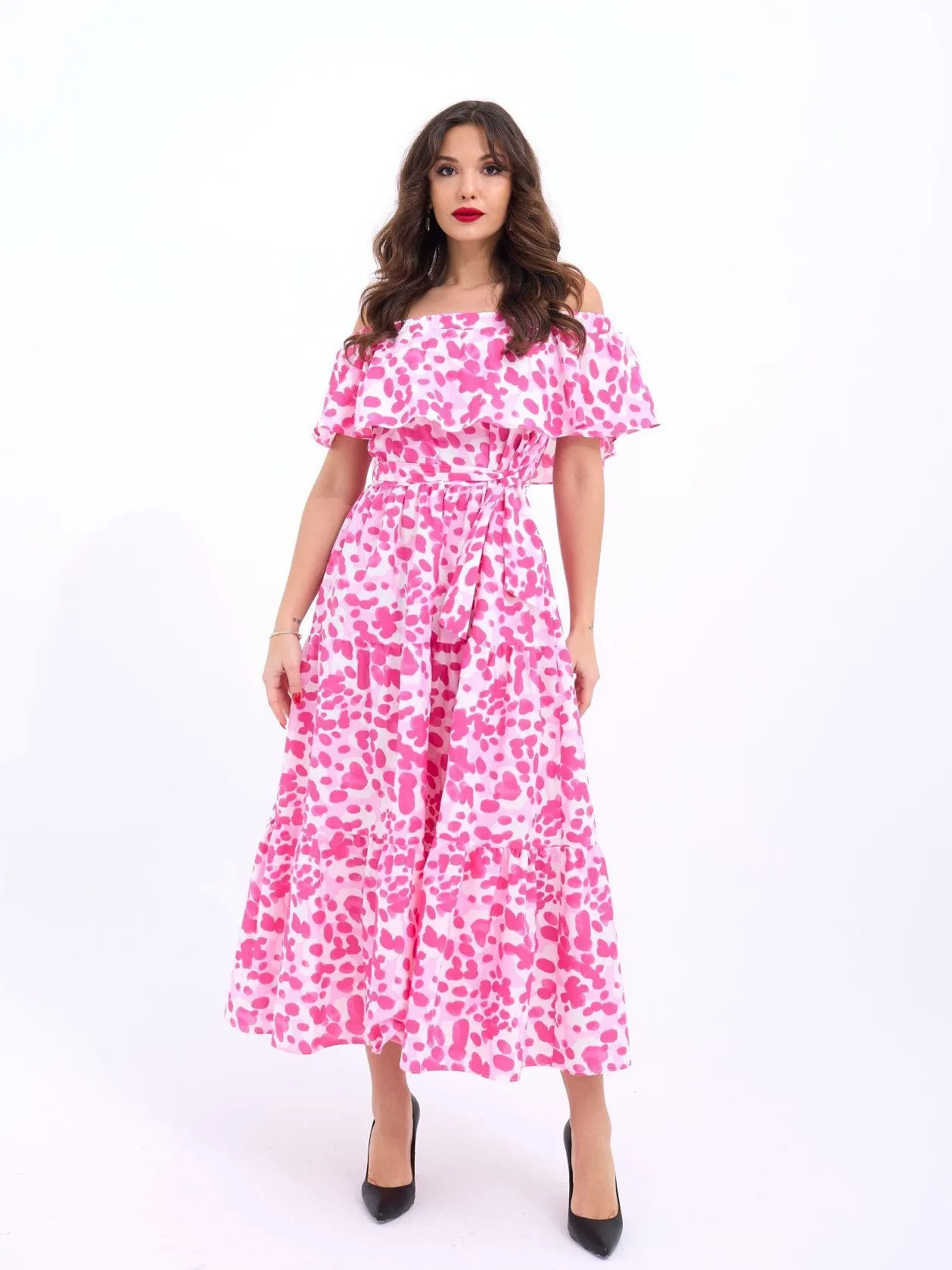 فستان ماكسي من فيسكوز بتصميم مفتوح الكتفين ورباط عند العنق وتفاصيل غير متماثلة، انسيابي وفني يناسب حرّ الصيف بخفة أنثوية.