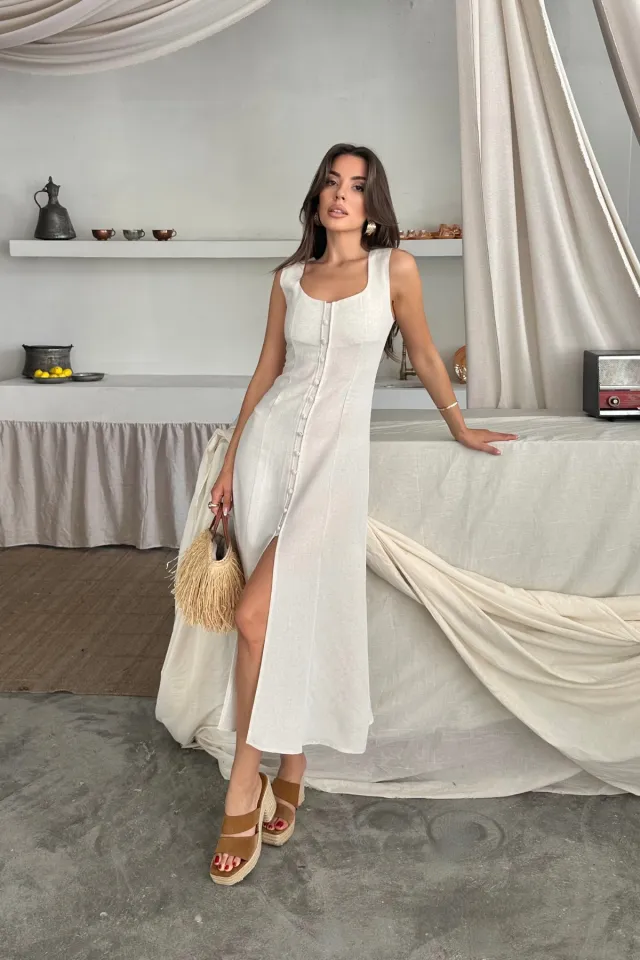 احسي بالانتعاش والأنوثة مع فستان ميدي من كريب بأكمام كاب منفوخة قصيرة وياقة دائرية وتنورة كلوش A‑شكل مطوية—كاجوال أنيق في أبسط صوره.