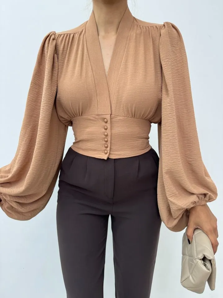 بلوزة بأكمام طويلة وقصة كتف منخفضة بياقة V مع تفصيل رباط أمامي وتصميم مخطط بشبك، تمنح النساء إطلالة صيفية كاجوال ومنعشة.