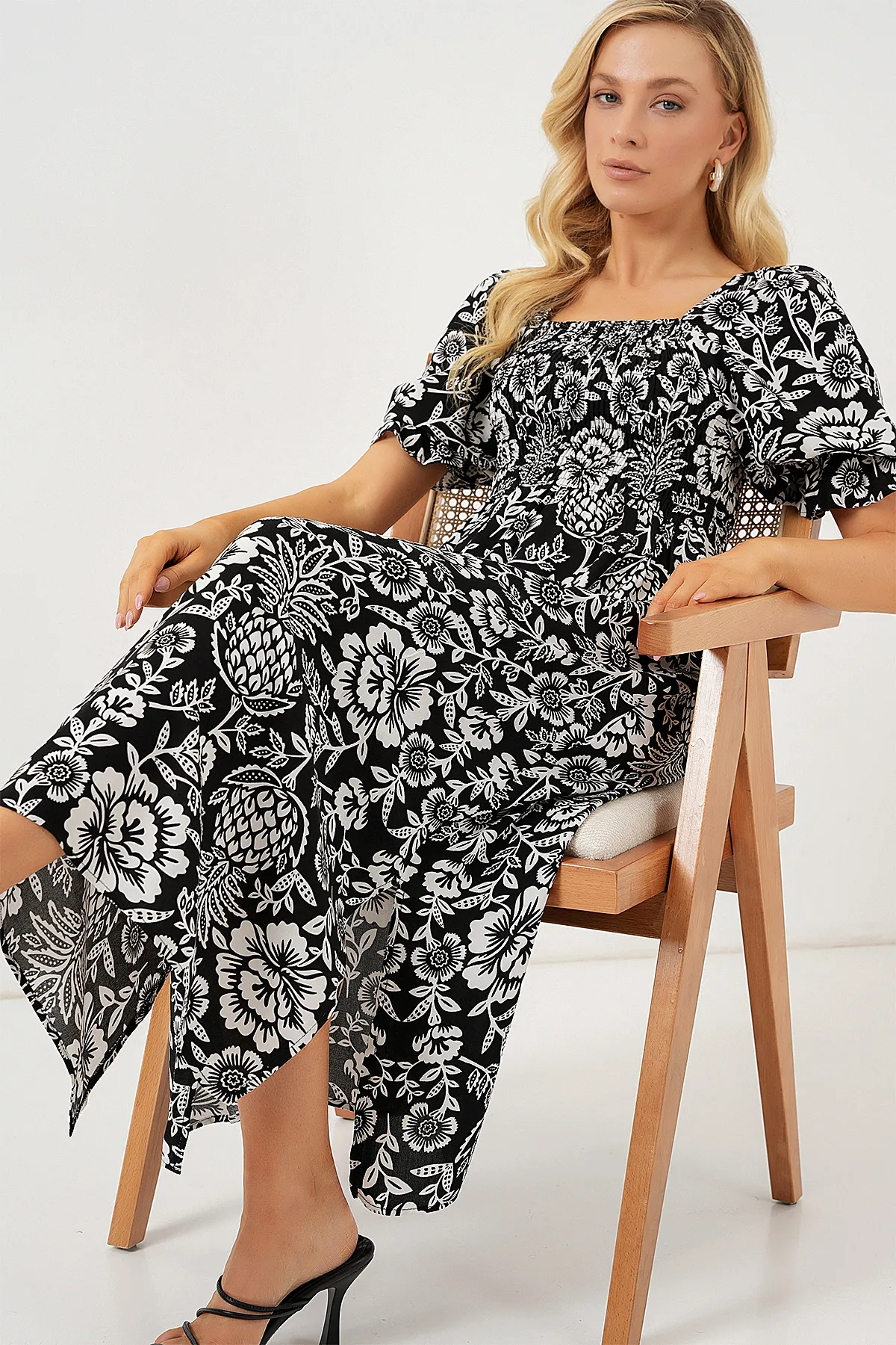 فستان قصير بحمالات وياقة V مزين بنقشة زهور، يمنح النساء إطلالة صيفية كيوت ومنعشة.