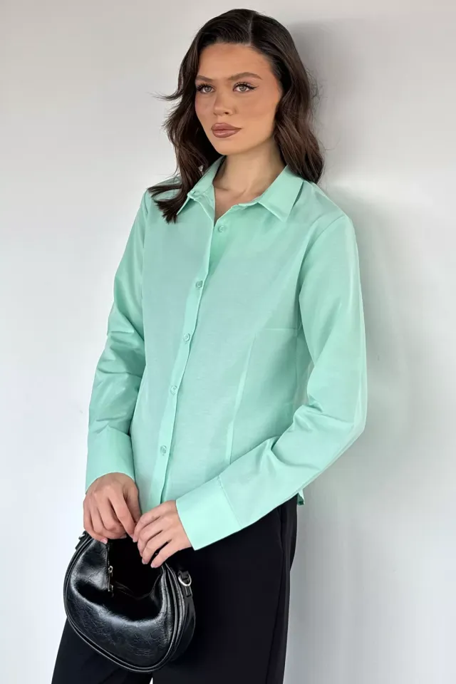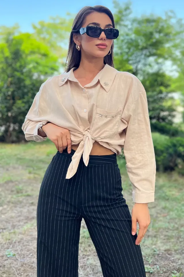 قميص نسائي نصف كم مخطط بأكمام منفوخة مع أزرار أمامية - Beyond Store