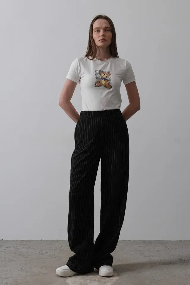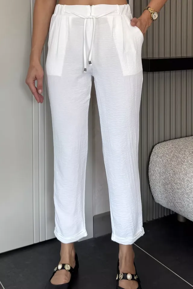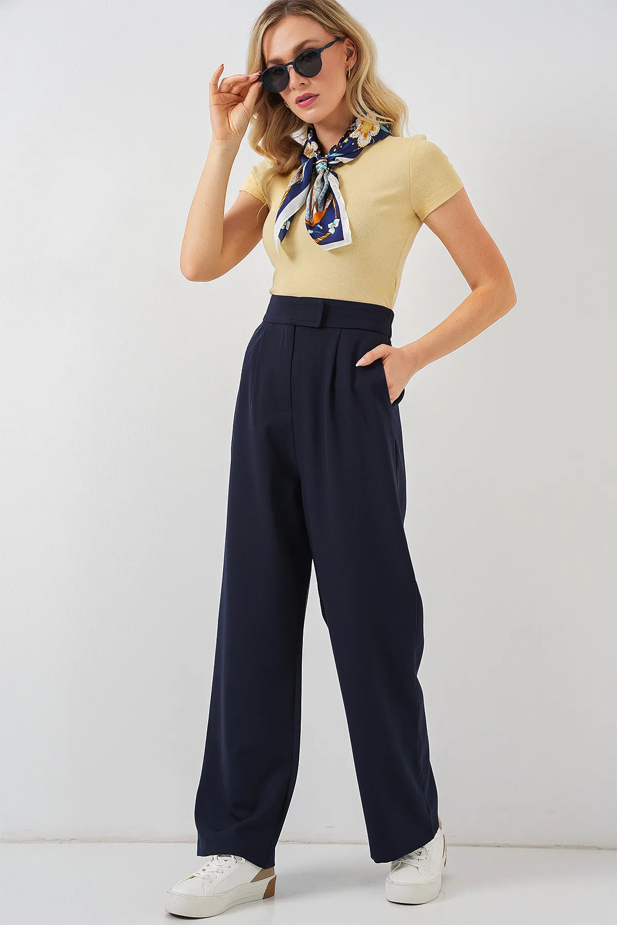 بنطلون نسائي واسع الساق بخصر عالي وحزام أنيق، بقصة انسيابية تمنح راحة وأناقة لإطلالات يومية أو رسمية متعددة الاستخدامات.