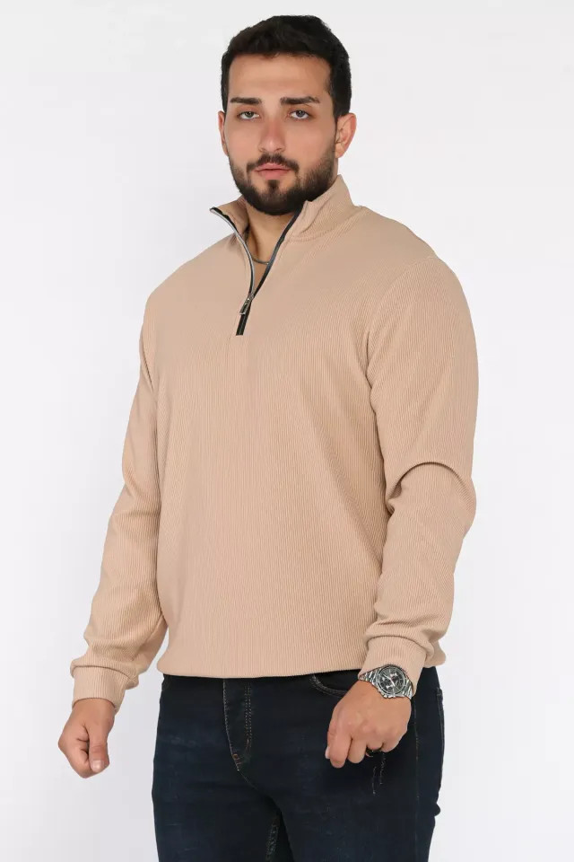 سترة رجالية بأكمام طويلة وياقة دائرية مضلعة بتصميم متين. مصنوعة من 70% قطن، 28% بوليستر، و2% إيلاستين لراحة ومرونة مثالية للارتداء اليومي.