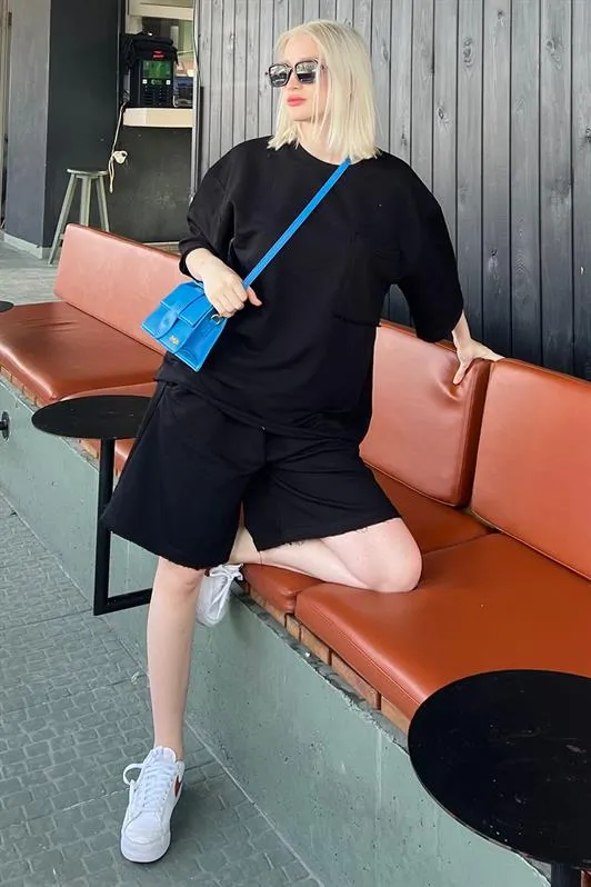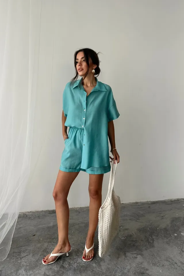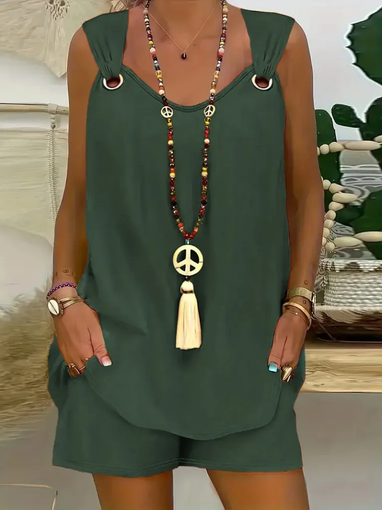 طقم مكون من بلوزة بحمالات وياقة دائرية بطبعة زهور مع شورت قصير لاطلالة صيفية انيقة للنساء