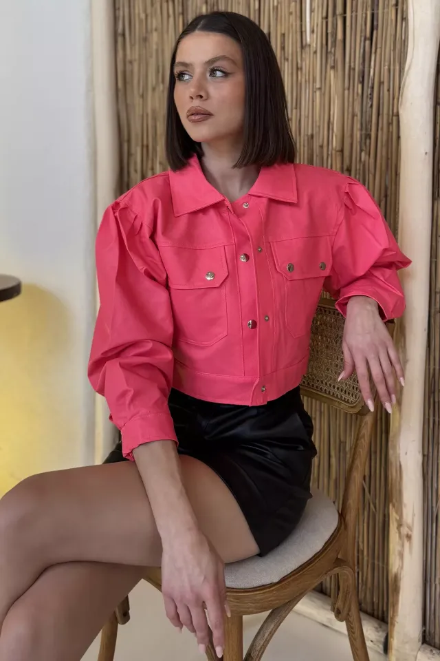 جاكيت جلدي قصير بأزرار أمامية وسحاب مع تفصيلة رباط لارتداء يومي