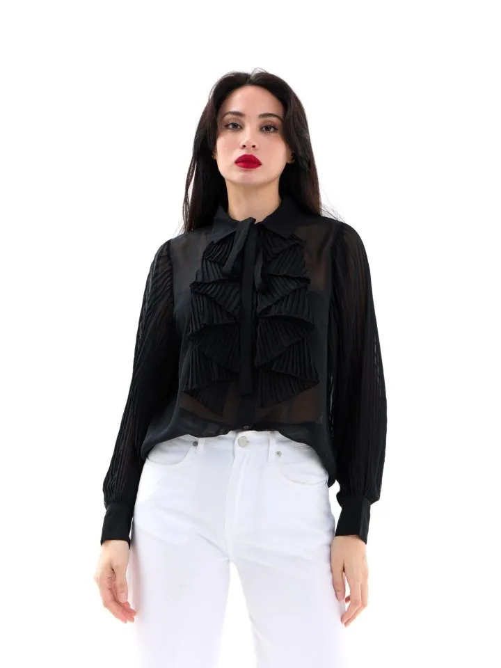 بلوزة قصيرة بأكمام طويلة وياقة مربعة مع تفاصيل أزرار، مصنوعة من قماش ناعم لتوفير مظهر أنيق ومريح مناسب للنزهات الكاجوال أو شبه الرسمية.