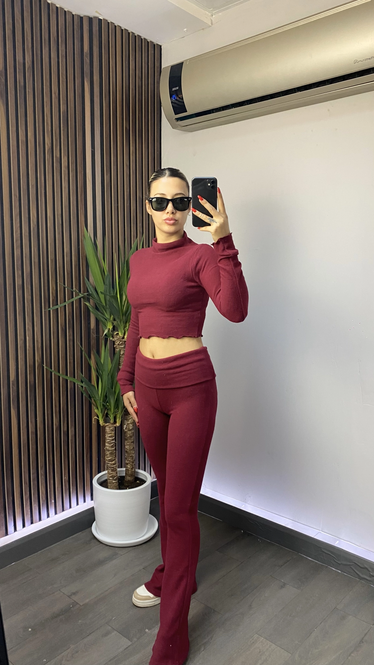 طقم مريح من بلوزة قصيرة بأكمام طويلة مع بنطلون ، مصنوع من قماش ناعم لإطلالة قابلة للتهوية وعصرية، مثالي للأيام الكاجوال أو الاسترخاء في المنزل.