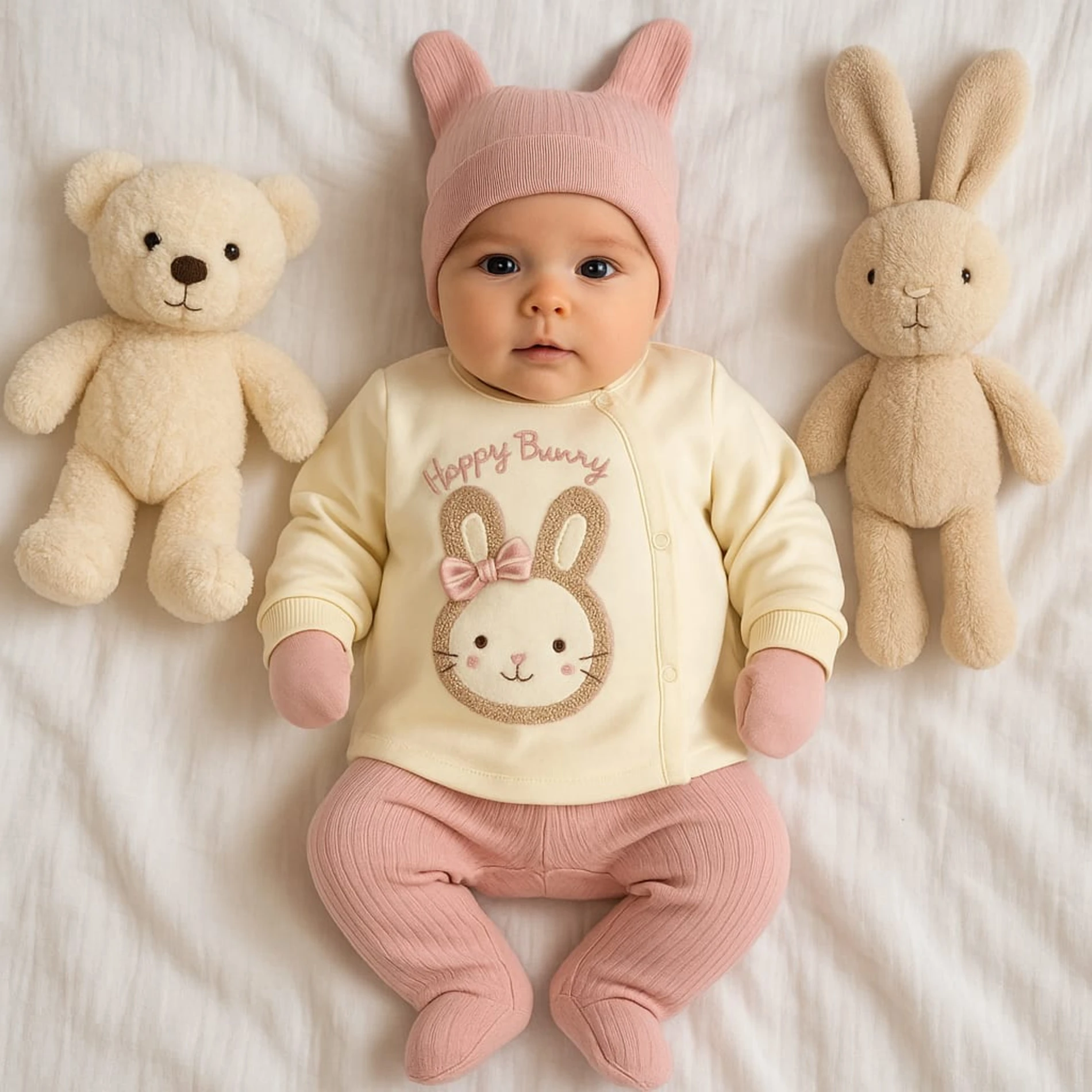 طقم بناتي للرضع 8 قطع بنقشة مطبوعة مع قبعة وقفازات وبنطلون مغطى القدمين