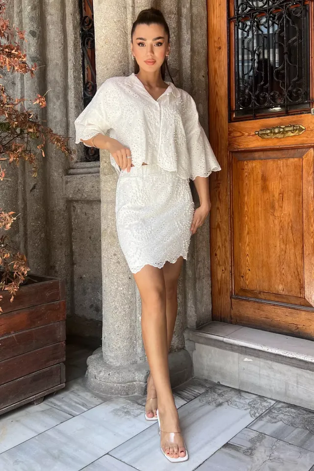 طقم عصري مكون من بلوزة مطبوعة بأكمام قصيرة منسق مع تنورة بنقشة جلد الفهد. خيار أنيق لإطلالات كاجوال وعصرية.