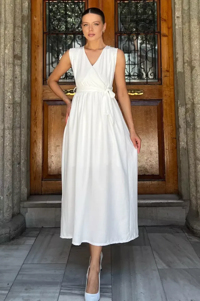 فستان نسائي ميدي بدون اكمام بخصر مجمع وحافة كشكش غير متماثلة لستايل صيفي انيق
