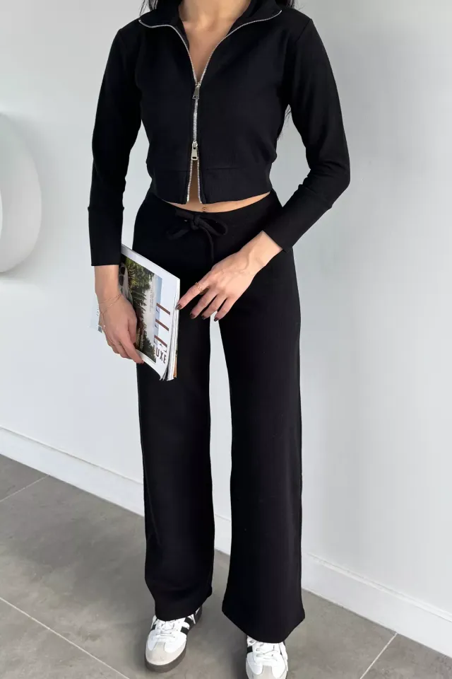 طقم عصري مكون من بلوزة قصيرة بأكمام طويلة مع بنطلون متناسق. مصنوع من قماش ناعم وخفيف ليمنحك الراحة والمظهر العصري الأنيق.