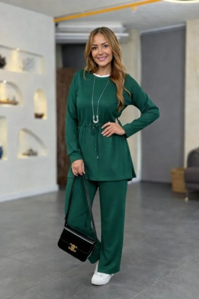 طقم أنيق مكون من بلوزة فيسكوز بأكمام طويلة مع قصّة غير متماثلة، مع بنطلون منقوش بالزهور. خيار مريح وعصري لإطلالة يومية أنيقة.