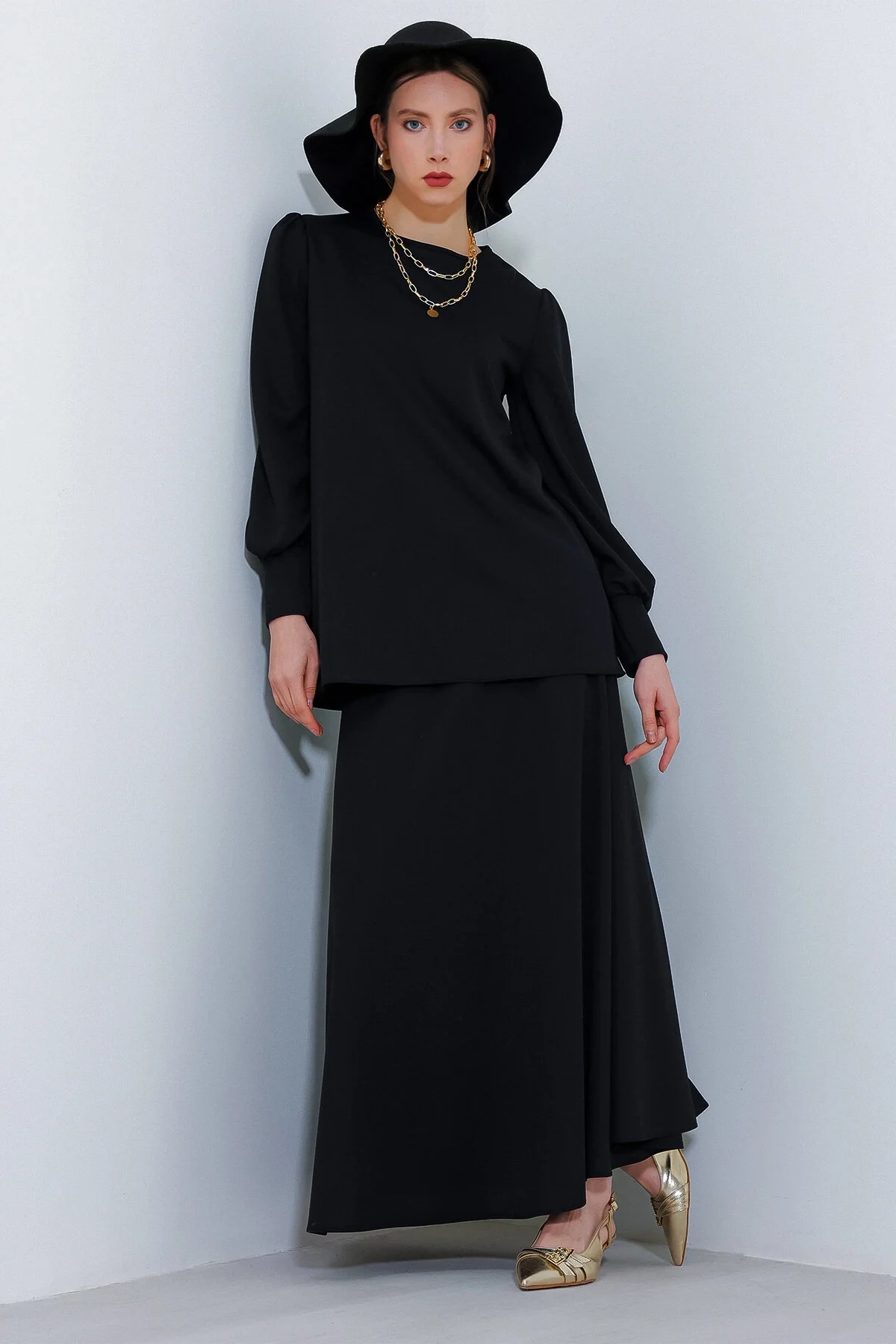 طقم نسائي محبوك يتضمن سويتر بأكمام طويلة وياقة على شكل حرف V مع تنورة ميدي مطابقة، يجمع بين الراحة والأناقة.