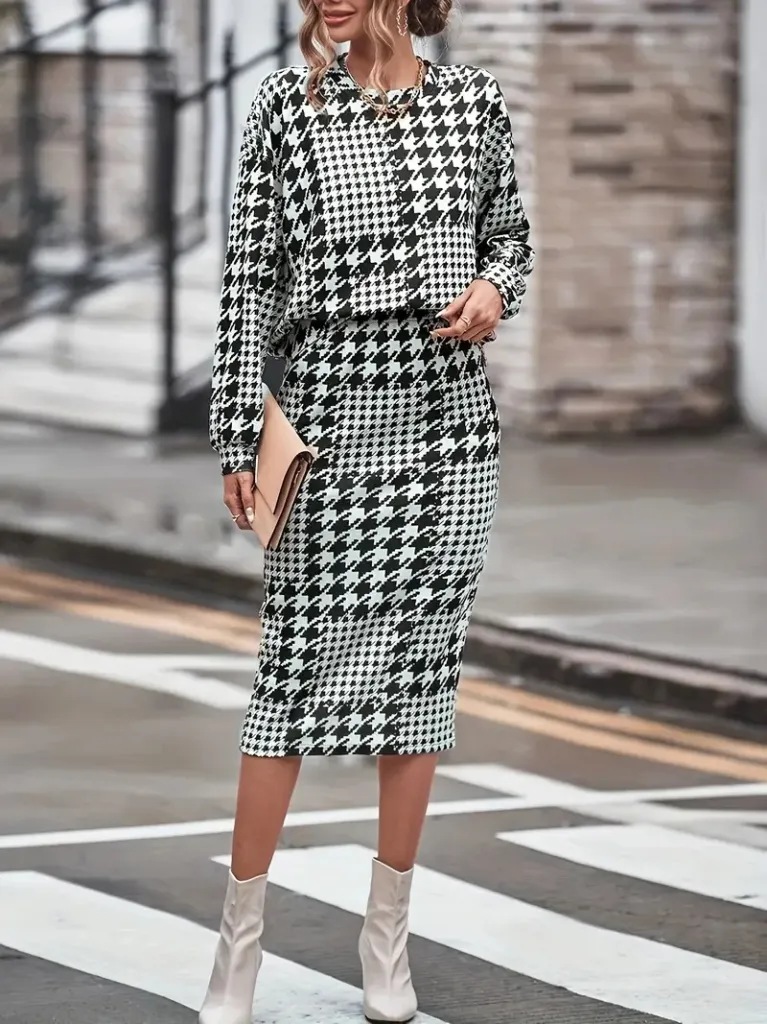 طقم تنورة ميدي محبوكة بأكمام طويلة و ياقة على شكل حرف V للنساء