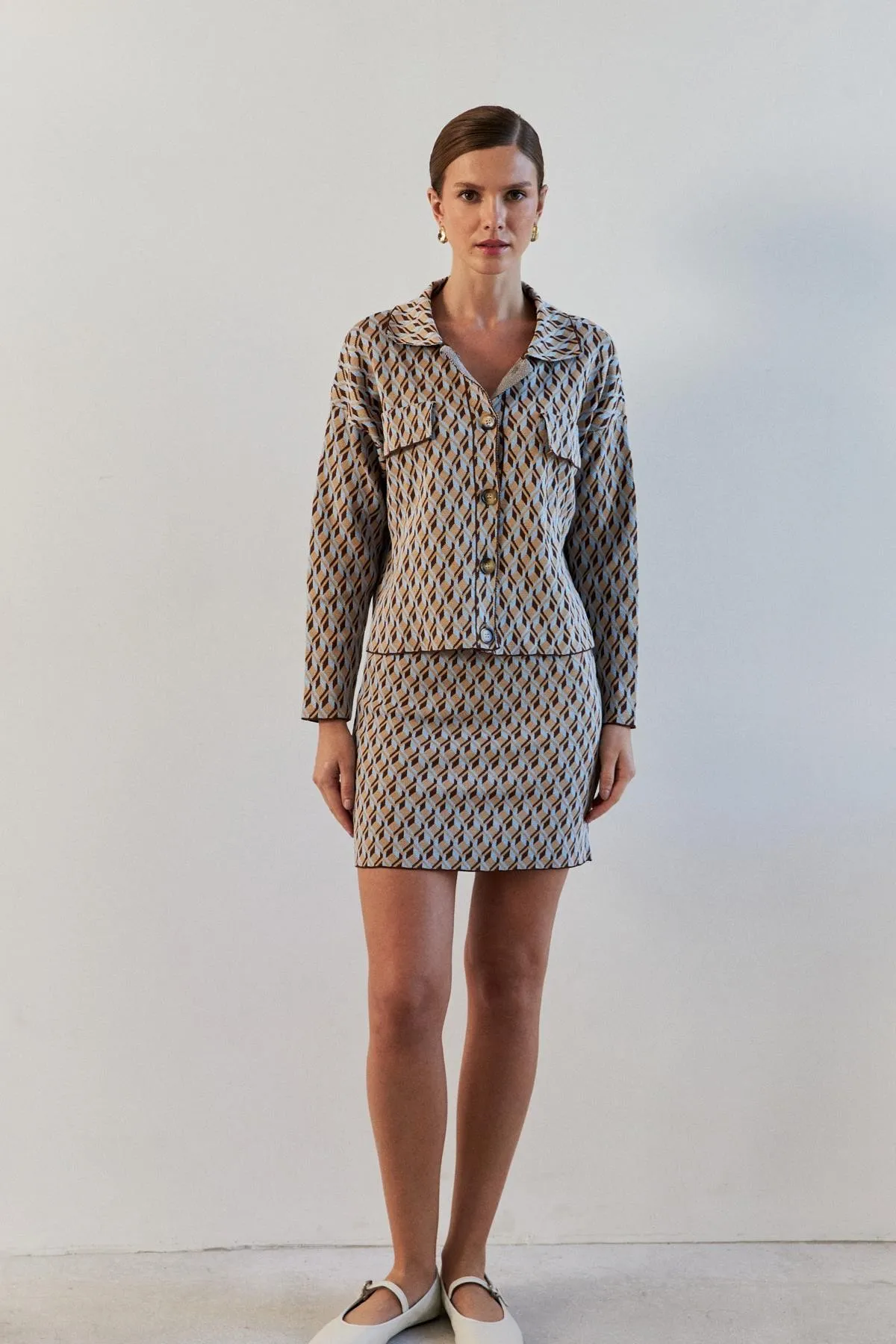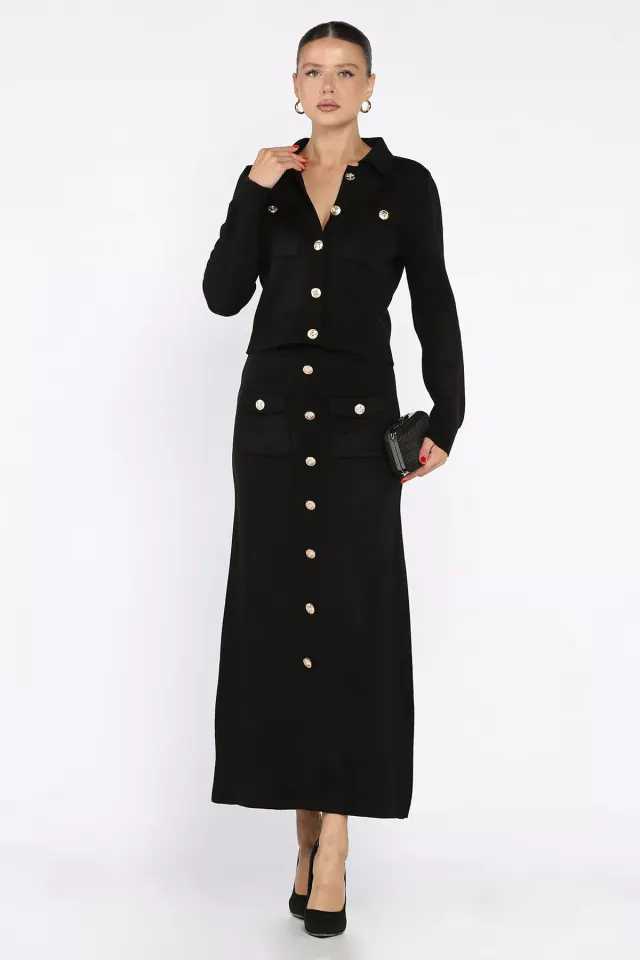 طقم نسائي محبوك يتضمن سويتر بأكمام طويلة وياقة على شكل حرف V مع تنورة ميدي مطابقة، يجمع بين الراحة والأناقة.