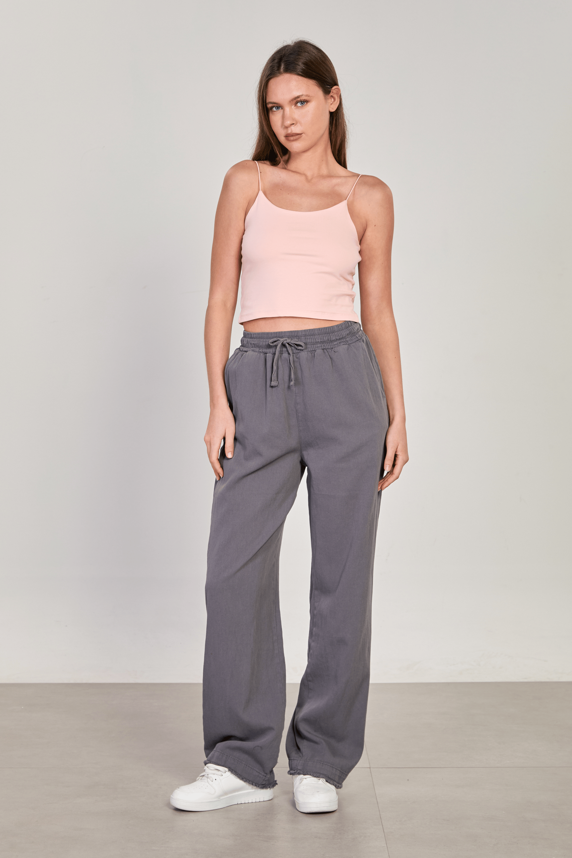 بنطلون ساتان واسع الساق بتصميم مهترئ، بخصر مطاطي وجيب مزدوج، يجمع بين الراحة والأناقة العصرية.