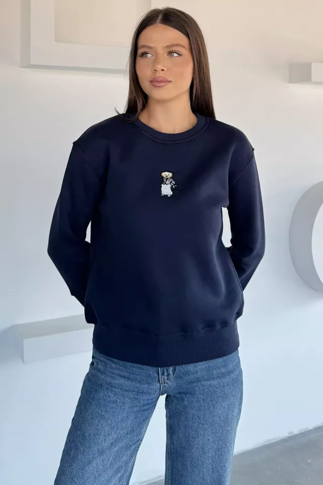 سويت شيرت نسائي بياقة دائرية مزين بطباعة أنيقة، يجمع بين الراحة والأناقة الكاجوال.