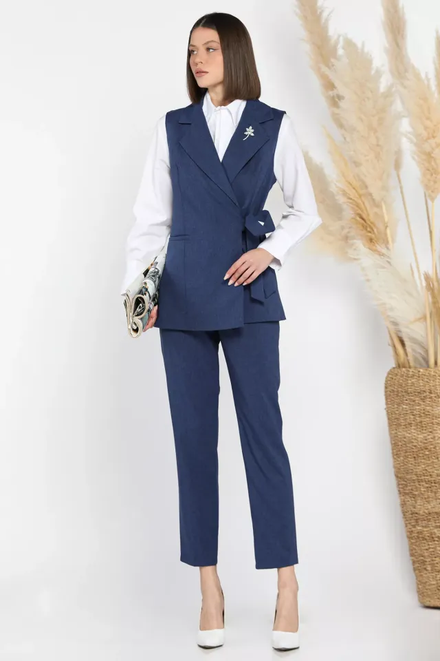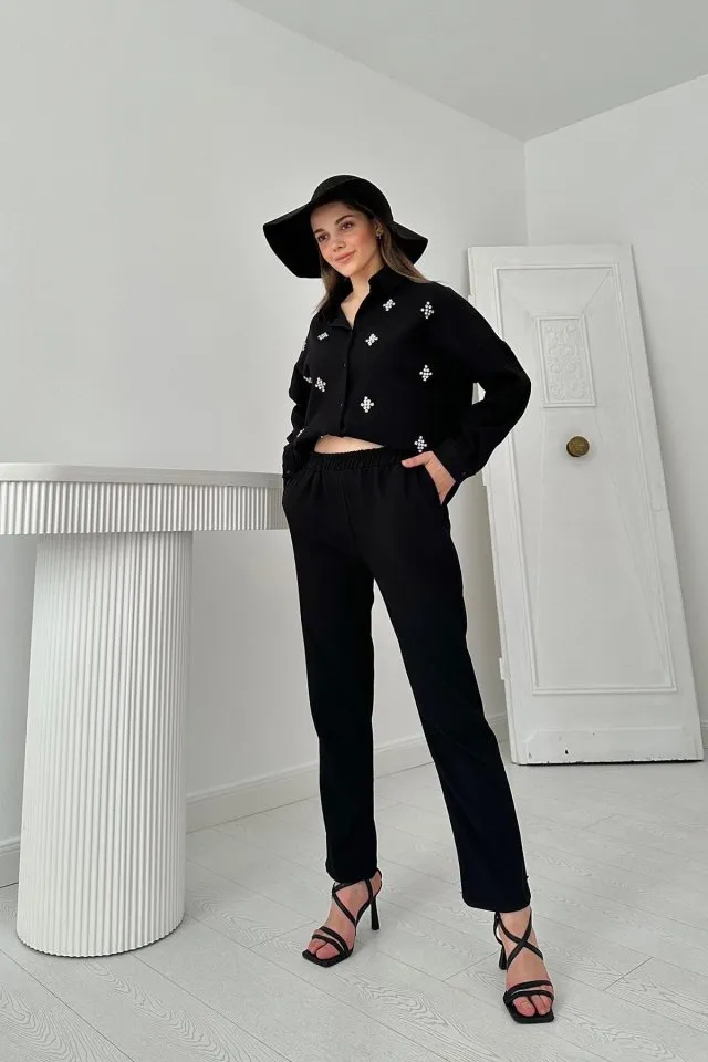 طقم نسائي مكون من جاكيت بياقة قميص مع أزرار أمامية وبنطال واسع بتفصيل شريط لإطلالة أنيقة في الخريف.
