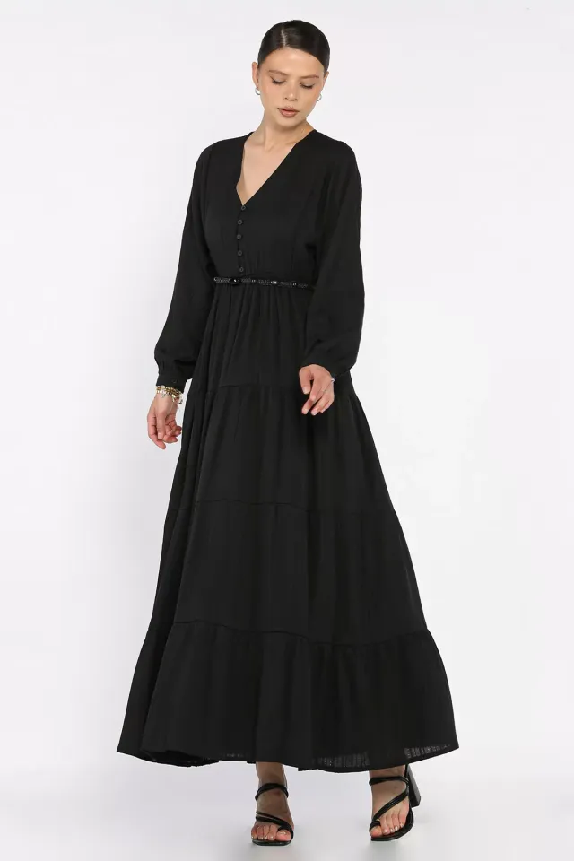 فستان تريكو ميدي بديكون بأكمام كلوش طويلة وياقة دائرية - Beyond Store