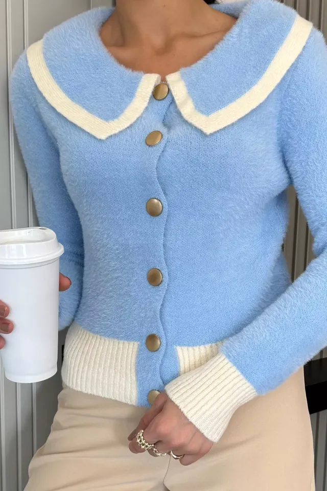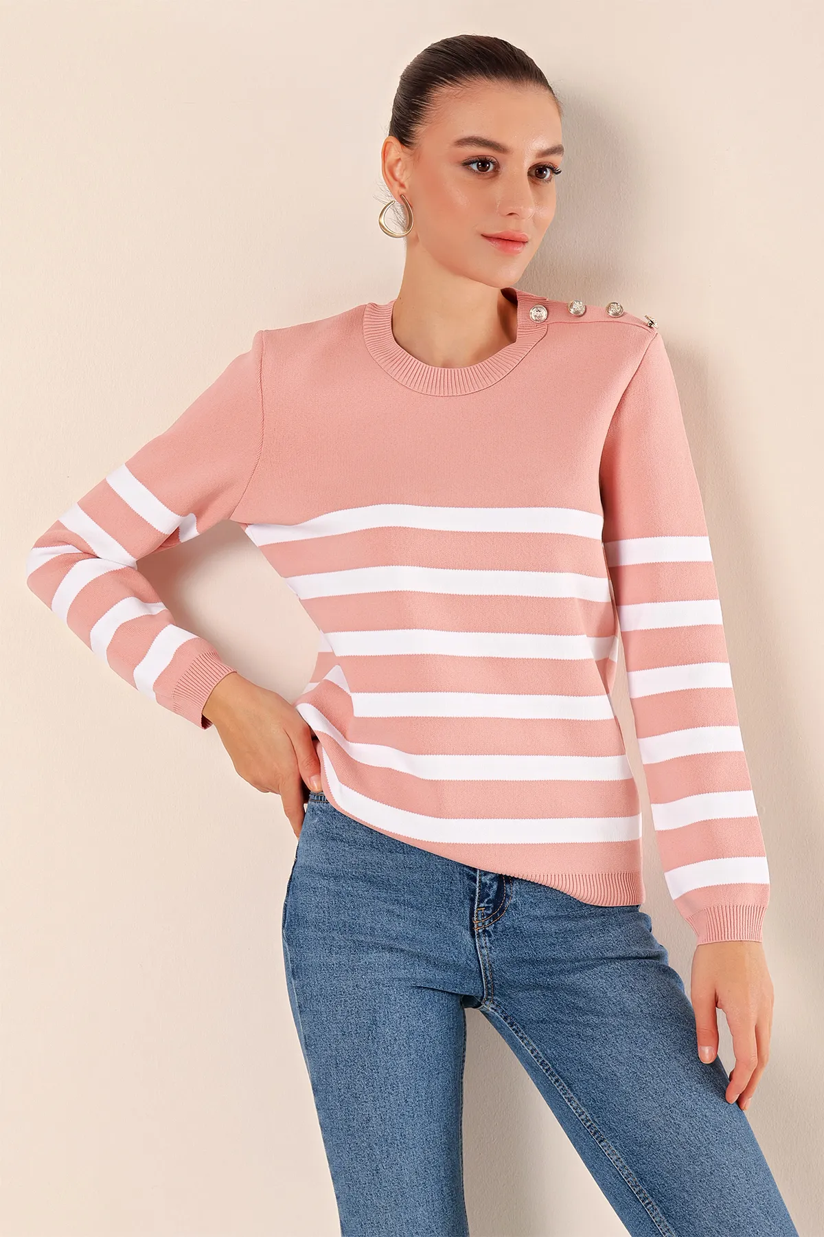 كنزة تريكو نسائية مخططة بياقة بولو وأزرار أمامية بقصة أوفرسايز مريحة مثالية لإطلالة شتوية كاجوال دافئة.
