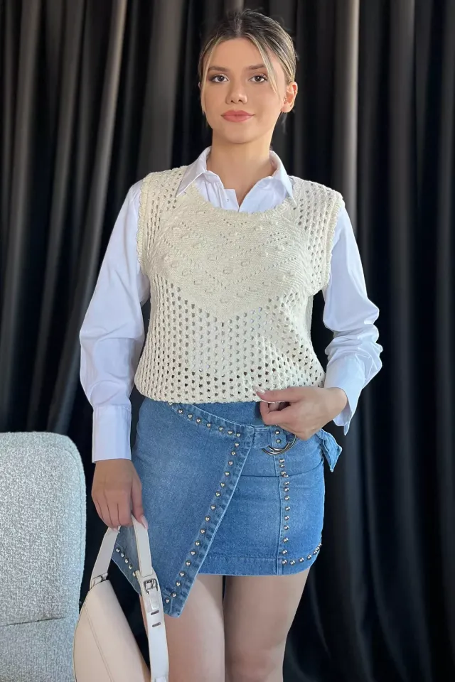 كنزة تريكو محبوكة بتصميم مضلع وياقة بولو أنيقة تضيف لمسة عصرية وعملية لإطلالاتك اليومية في الشتاء. قماش محبوك غير مبطن، قصة عادية، الموديل ترتدي مقاس قياسي – الطول 174 سم، الوزن 58 كغ، الصدر 86 سم، الخصر 66 سم، الورك 95 سم
