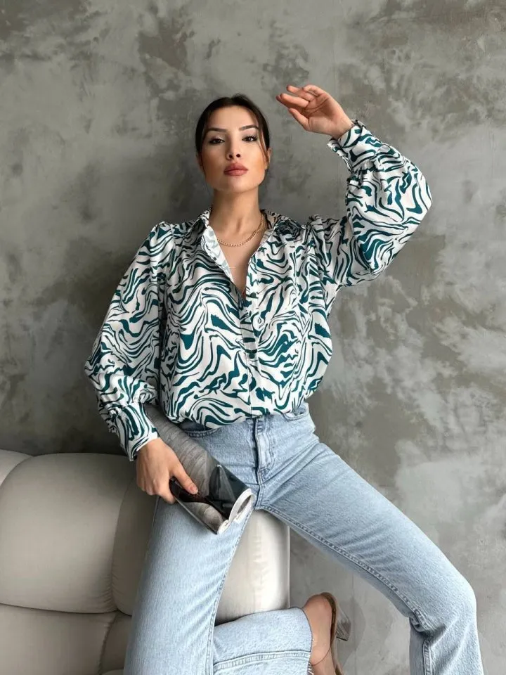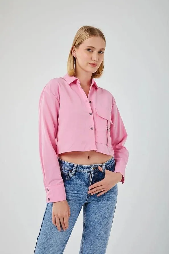 قميص كتان واسع بكتف منخفض مع جيب واحد واغلاق ازرار