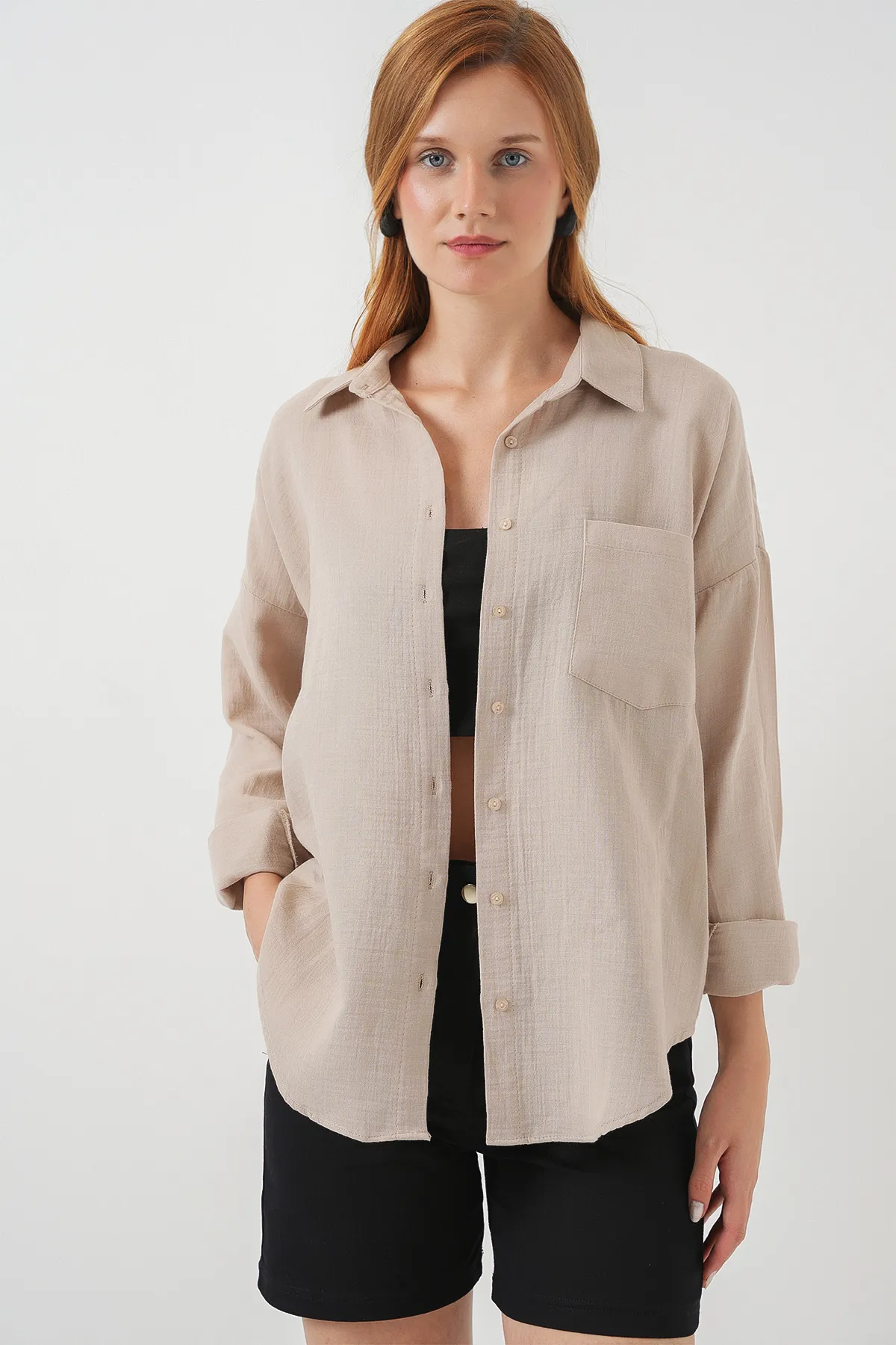 قميص فيسكوز منسوج بياقة V مع فتحة وازرار معدنية - Beyond Store