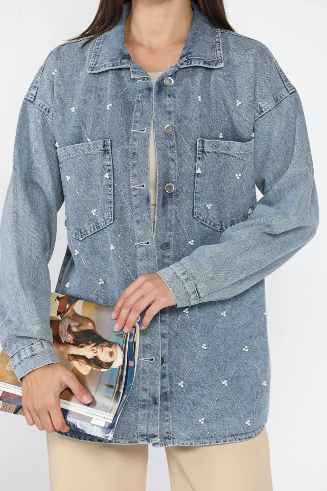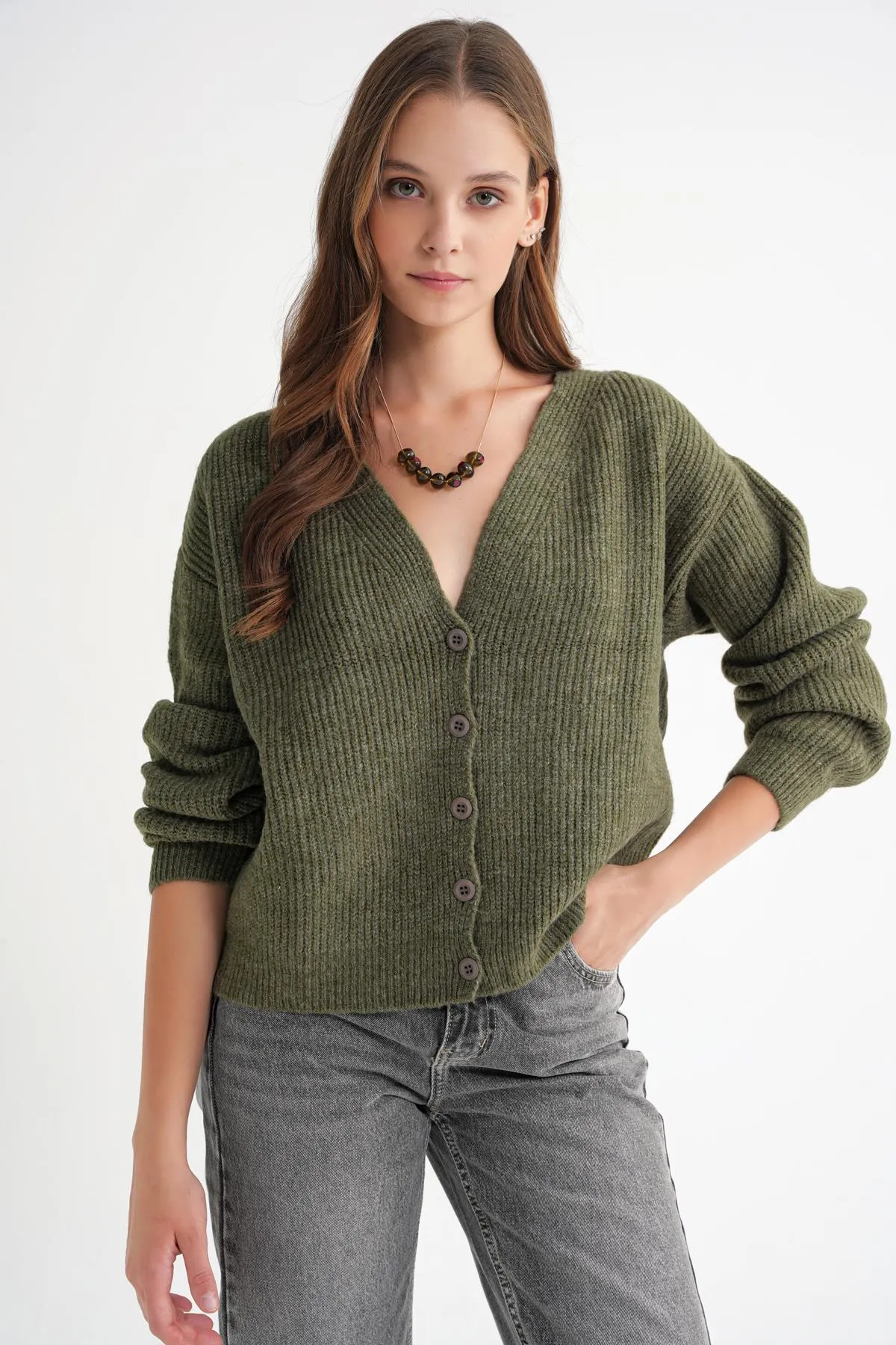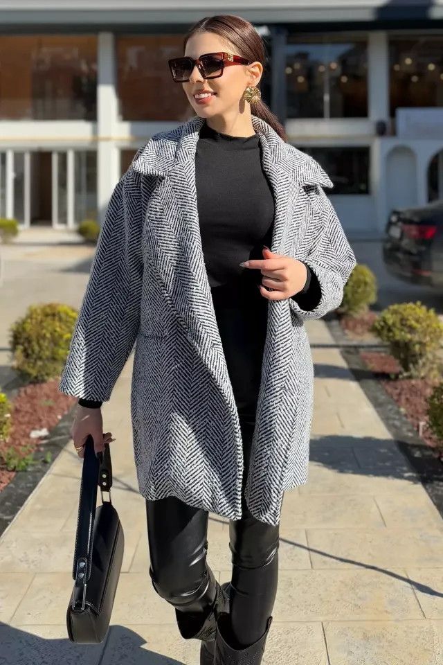 الموديل ترتدي مقاس M/38 – الطول 165 سم، الوزن 55 كغ، الصدر 90 سم، الخصر 72 سم، الورك 100 سم