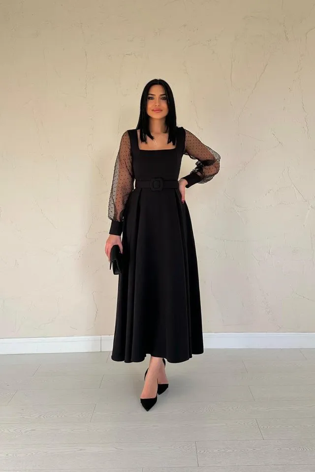 فستان ميدي محبوك بياقة بولو واكمام طويلة بقصة انسيابية للنساء لإطلالة يومية أنيقة.